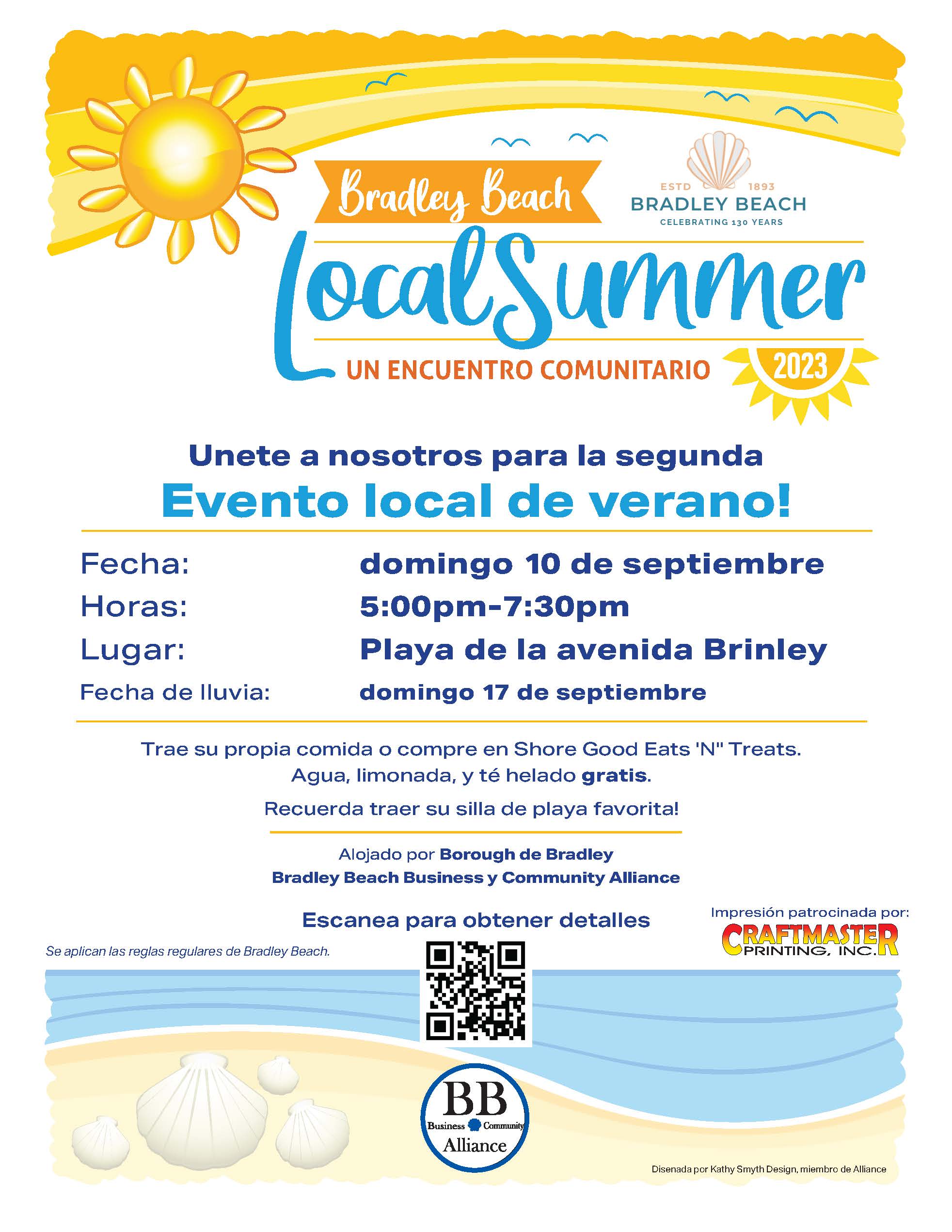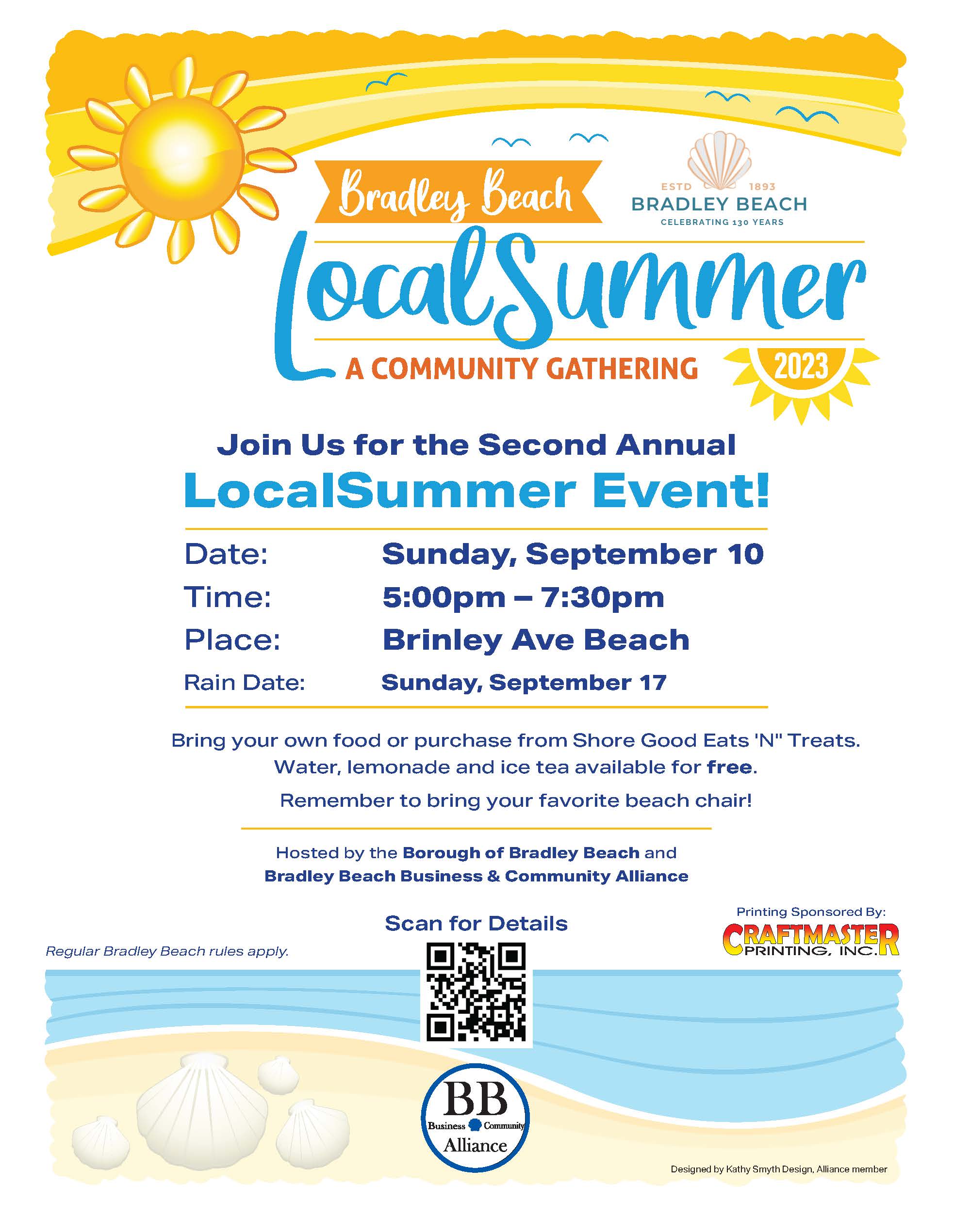 LocalSummer 2023 – Sunday, September 10 5pm – 7:30pm at Brinley Avenue BeachWe are celebrating our 130th Anniversary !Open to All Bradley Beach Residents ! Free! Bring Your Own FoodYou can also purchase food from Shore Good Eats and Treats , a very popular food truck on the Jersey Shore. Their eclectic menu is always a hit and we are excited that they have included Bradley Beach in their busy schedule.Check out www.FeelGood Shuttles.com to book a free ride.There will be games and prizes. Bring your 2023 beach badge for special prizes .And of course, bring your favorite beach chair !Sunday September 10 will a great celebration of our 130th Bradley Beach Anniversary of our special town with great neighbors.Sponsored by Borough of Bradley Beach and Bradley Beach Business & Community Alliance.