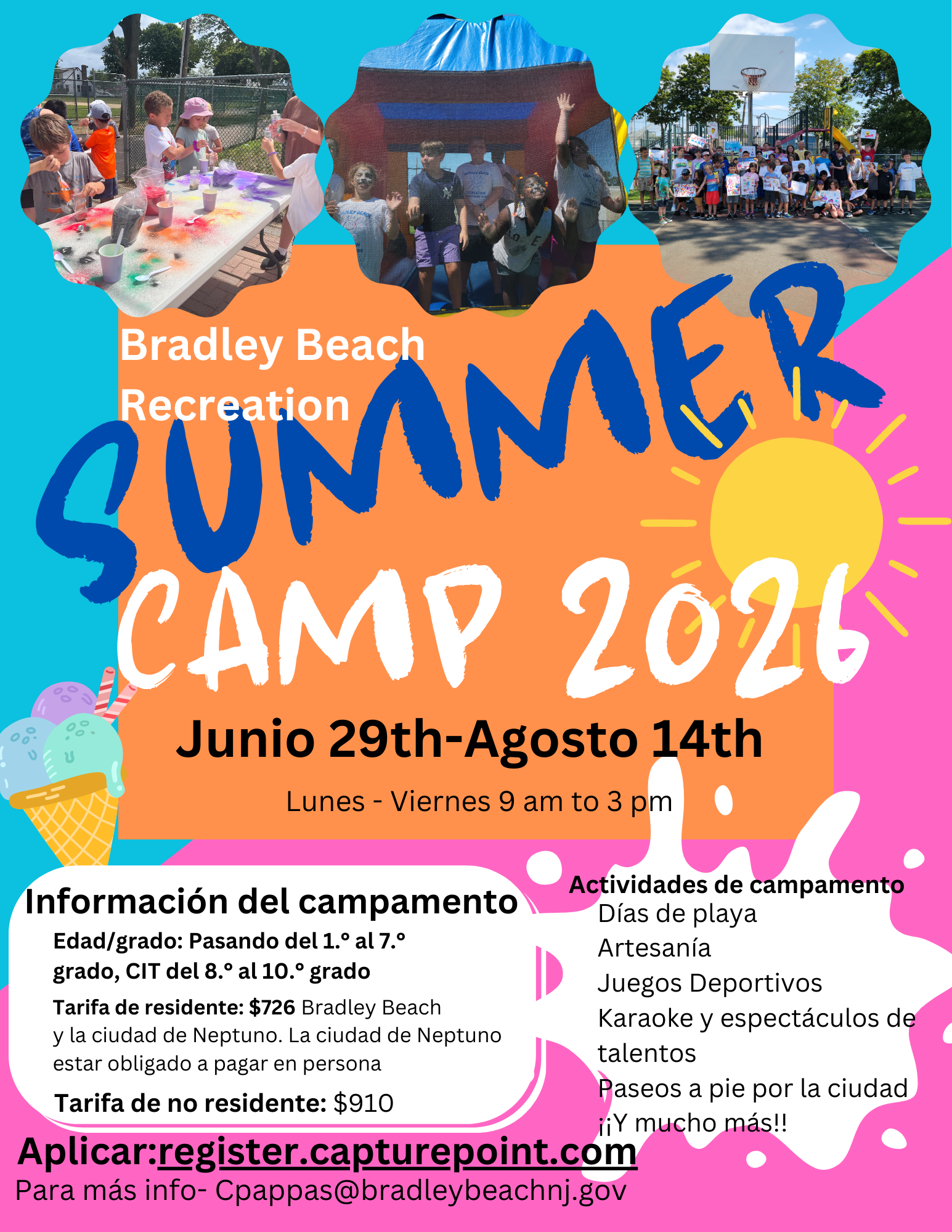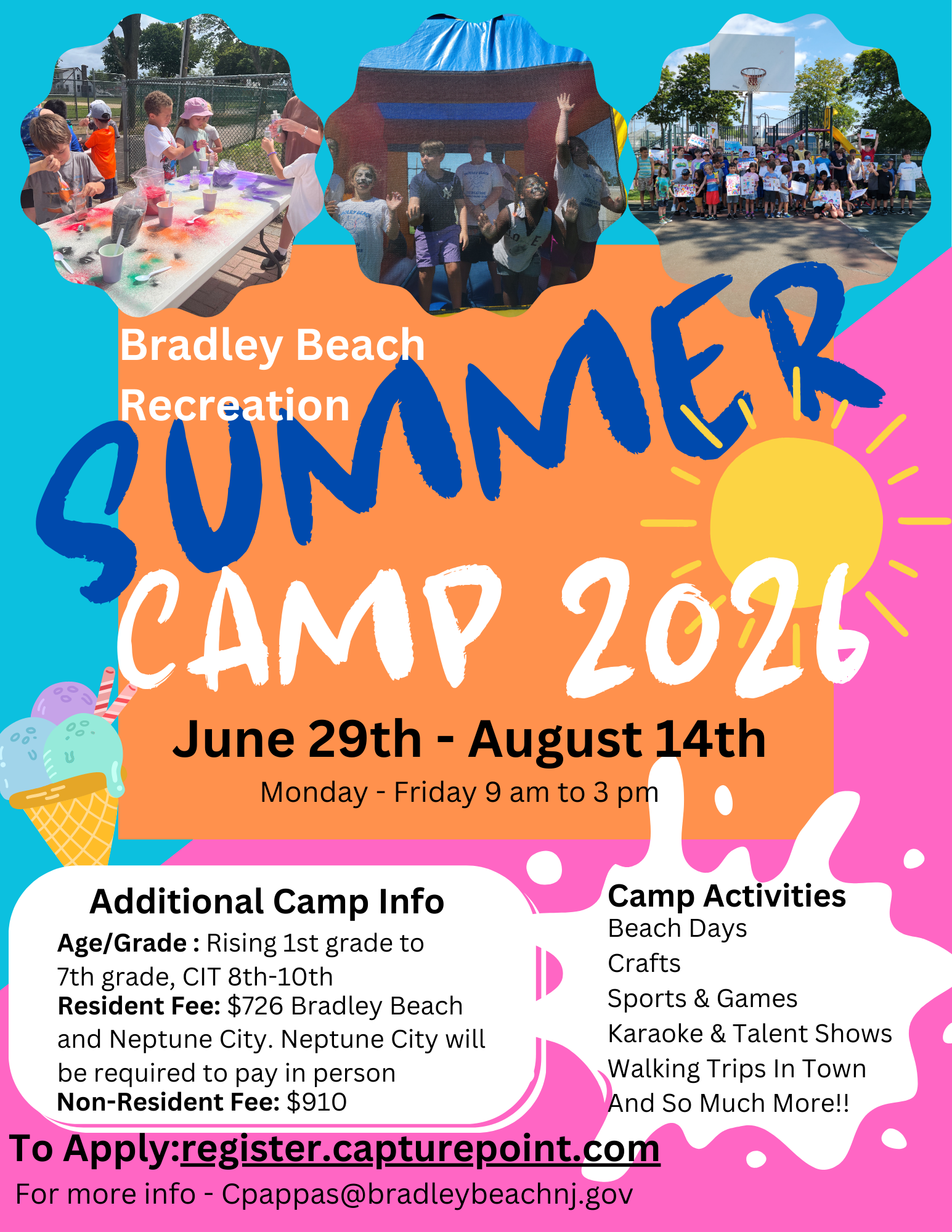 Recreation CalendarFull Day Camp - https://register.capturepoint.com/reg/cat_program_list_detail.cfm?season_id=32296&program_id=2737833 CIT Program - https://register.capturepoint.com/reg/cat_program_list_detail.cfm?season_id=32296&program_id=2737834 Half Day Camp For BBES Students Only - https://register.capturepoint.com/reg/cat_program_list_detail.cfm?season_id=32296&program_id=2737835 Â Â